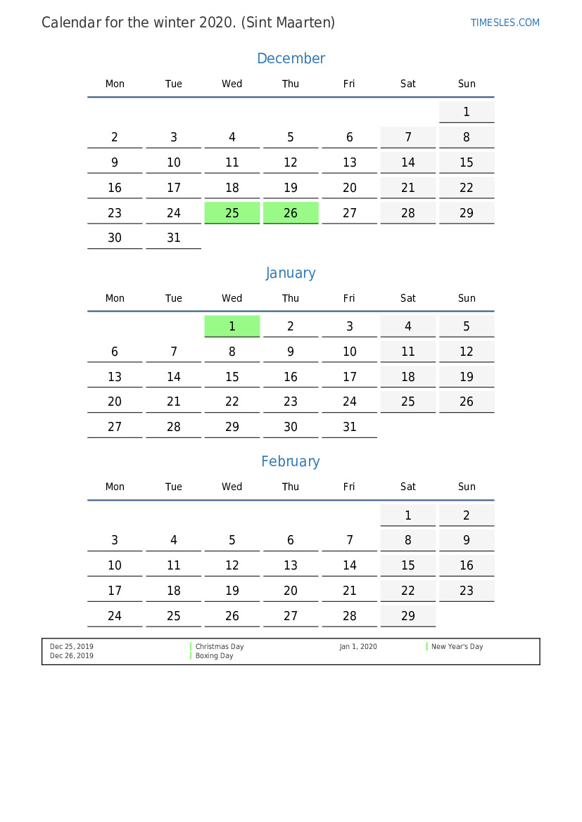Download and print PDF calendar with holidays and weekends for the winter of 2020 for Sint Maarten