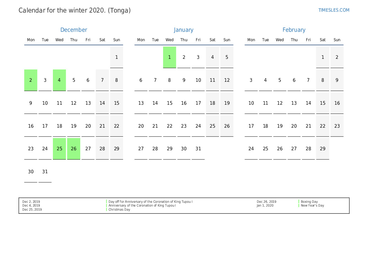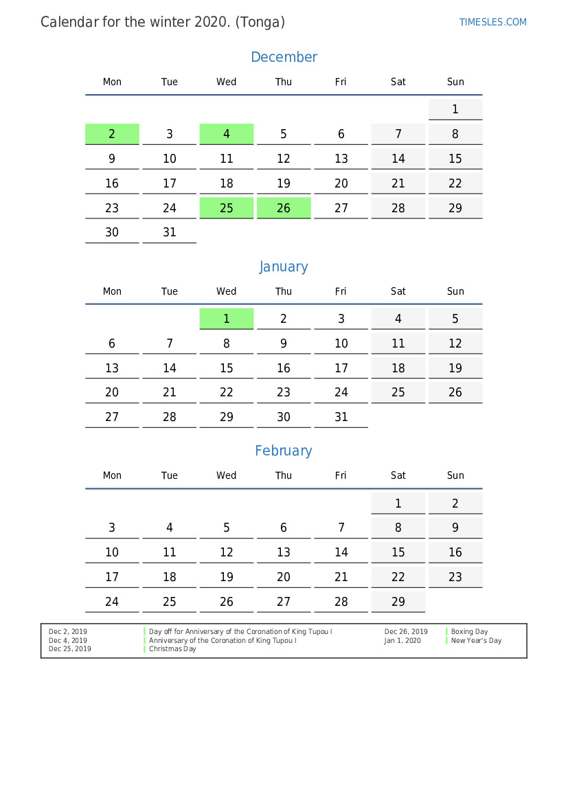 Calendar of holidays and weekends for the winter of 2020 for Tonga