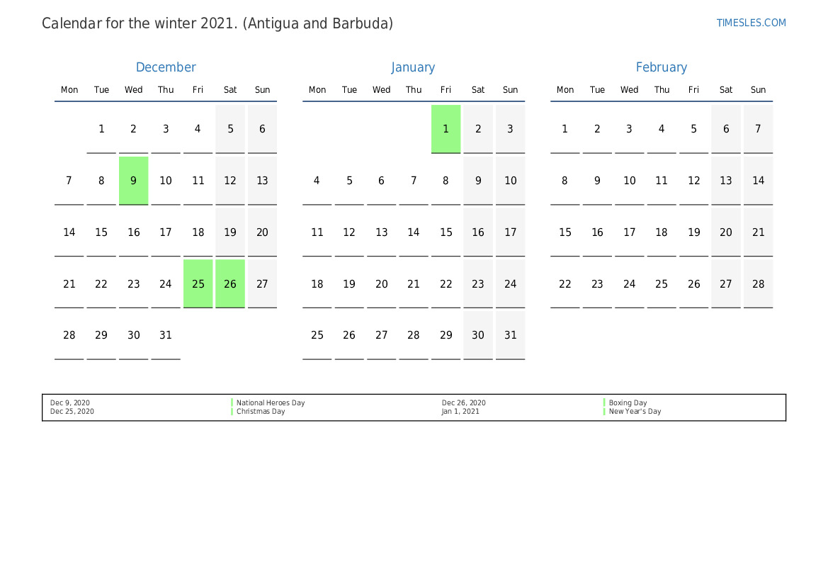 Calendar of holidays and weekends for the winter of 2021 for Antigua and Barbuda