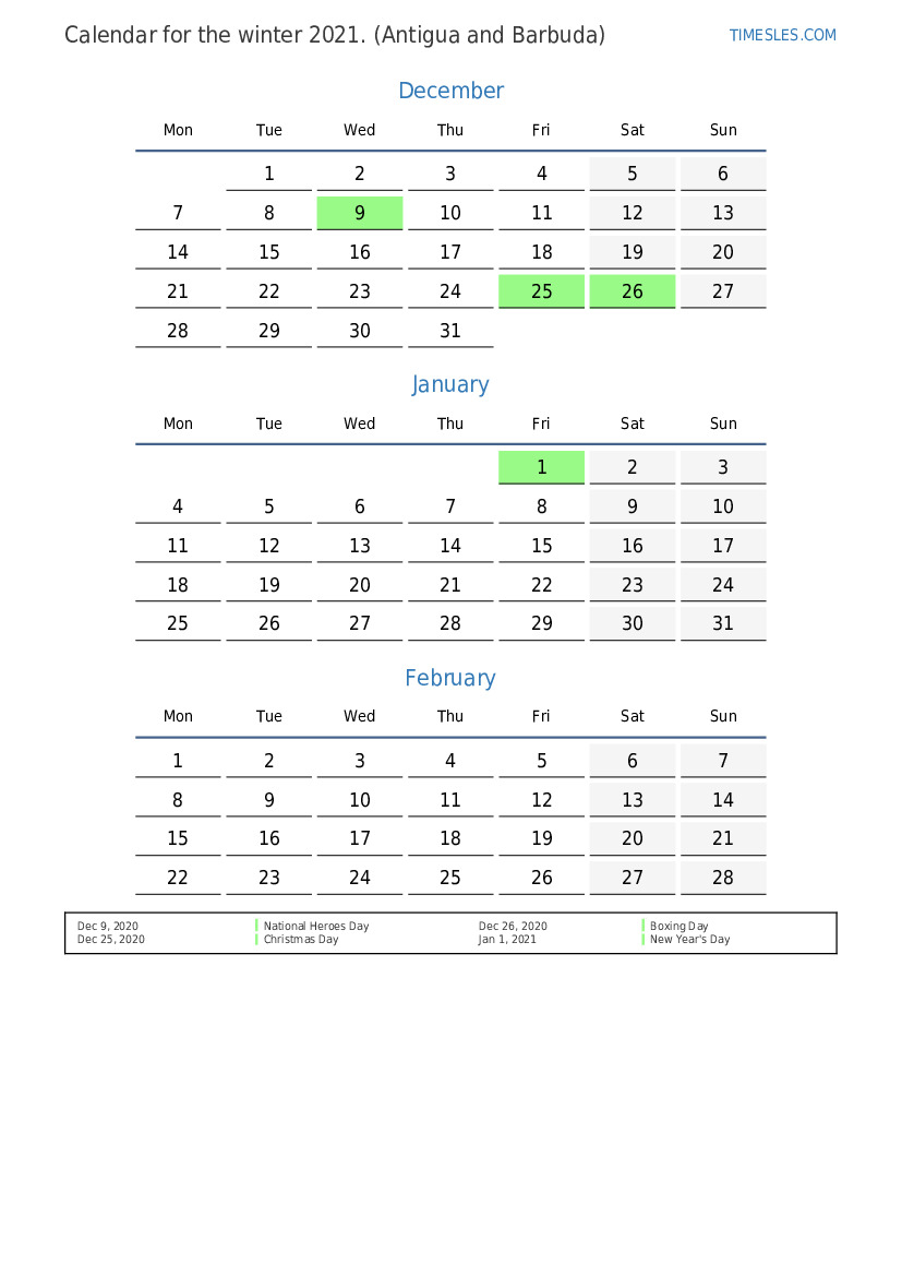 Download and print PDF calendar with holidays and weekends for the winter of 2021 for Antigua and Barbuda