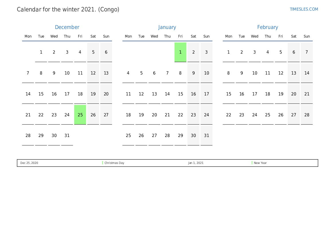 In the winter of 2021, there are 3 holidays and days off in Congo. Winter 2021 starts on Tuesday and ends on Sunday.