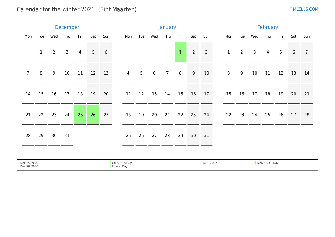 Download and print PDF calendar with holidays and weekends for the winter of 2021 for Sint Maarten