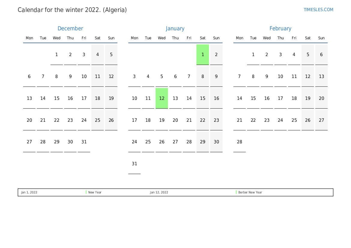 Winter calendar 2022 for Algeria