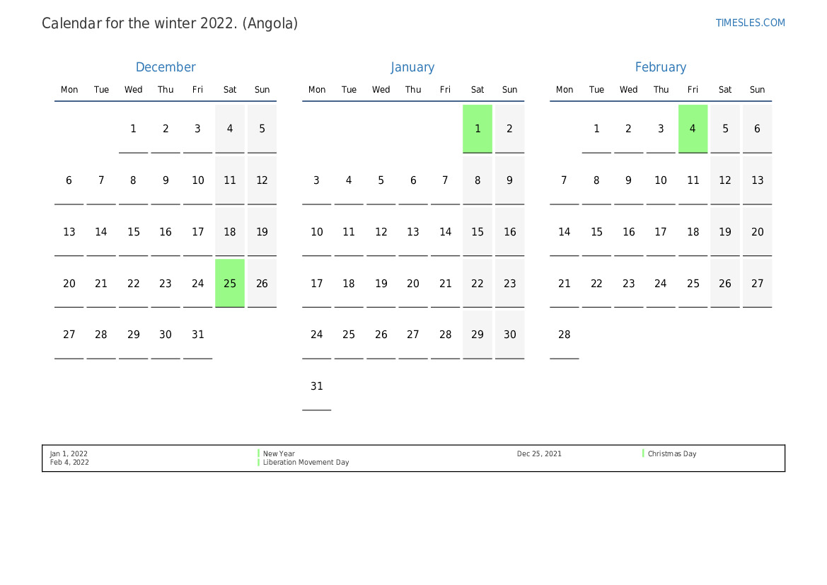 In the winter of 2022, there are 4 holidays and days off in Angola. Winter 2022 starts on Wednesday and ends on Monday.