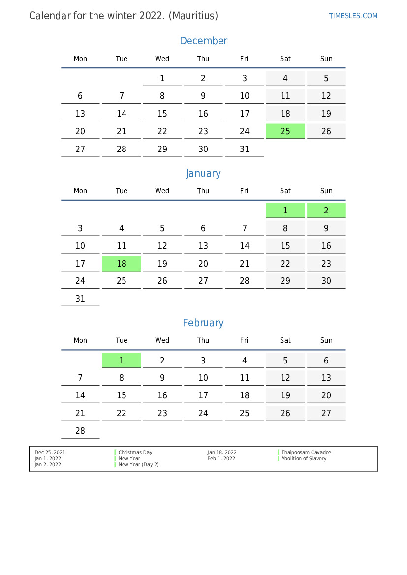 Download and print PDF calendar with holidays and weekends for the winter of 2022 for Mauritius