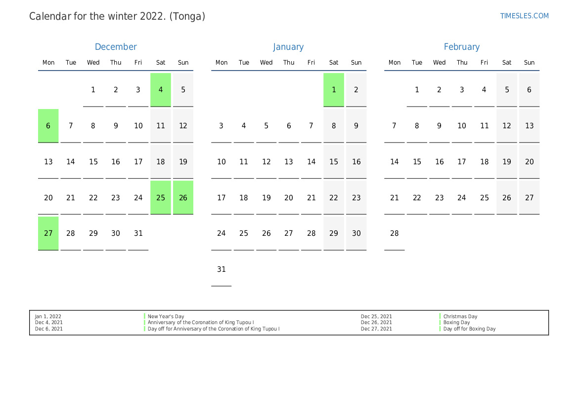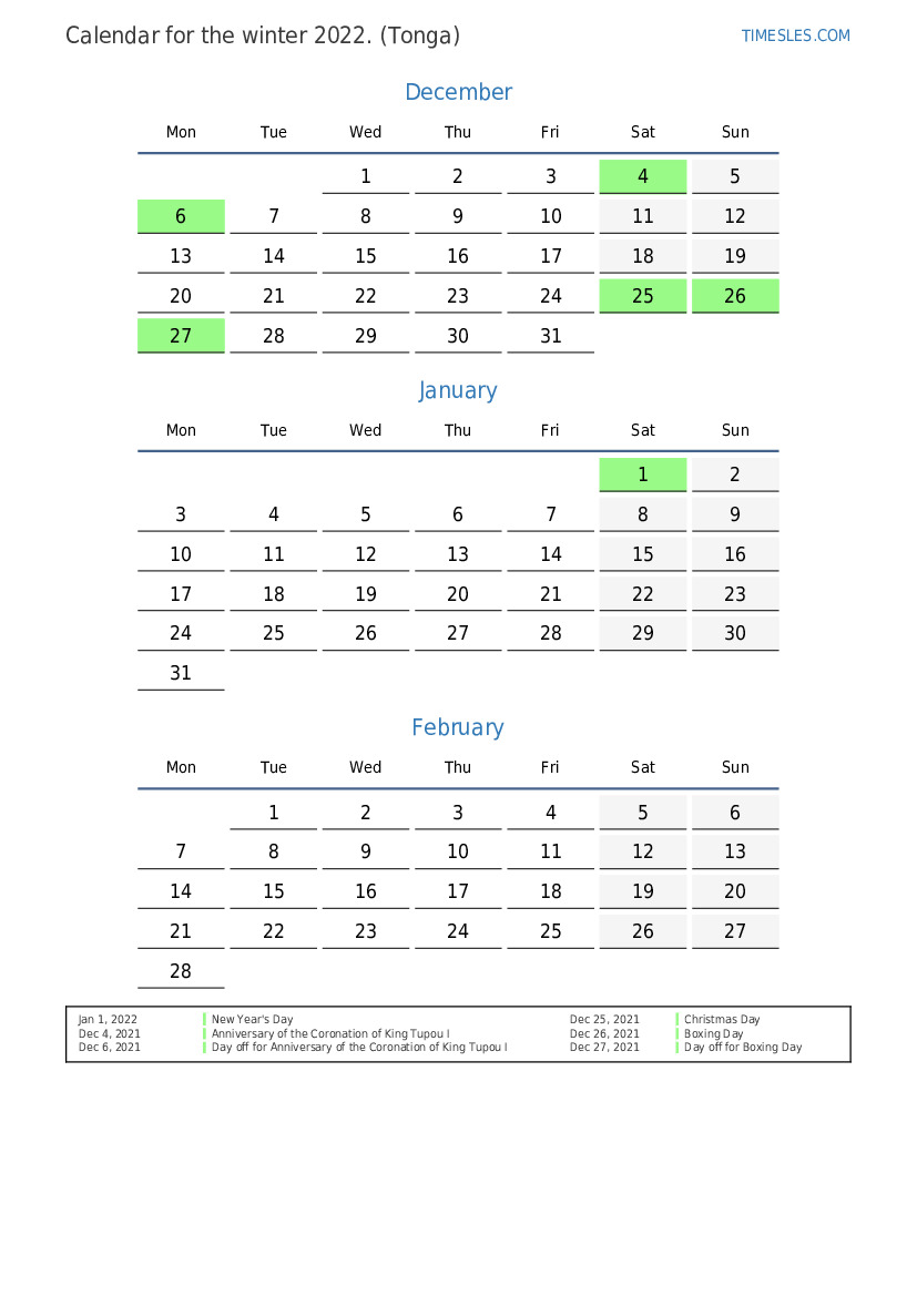 Download and print PDF calendar with holidays and weekends for the winter of 2022 for Tonga