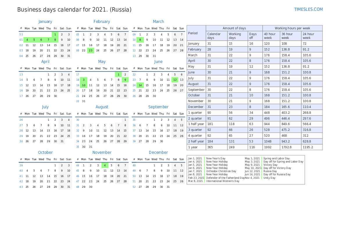 Working days for October 2021. There are 1 holiday and day off in Russia for October 2021.