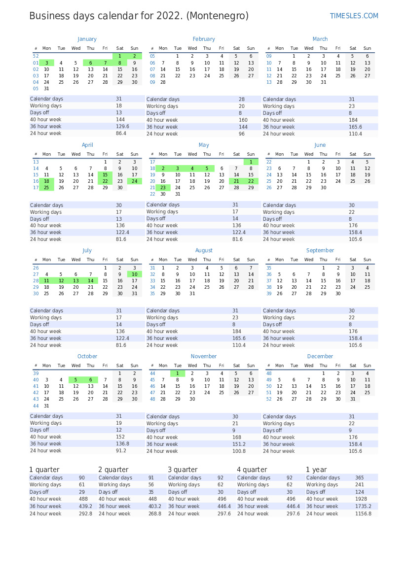 Working days for 2022. There are 36 holidays and days off in Montenegro in 2022.