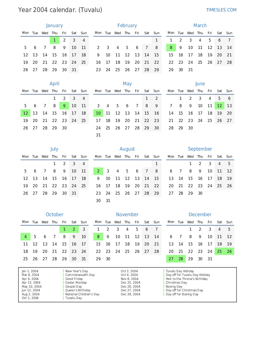 Oct 4, 2004 Day off for Tuvalu Day Holiday