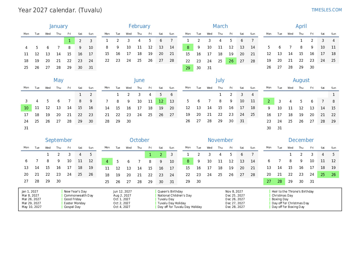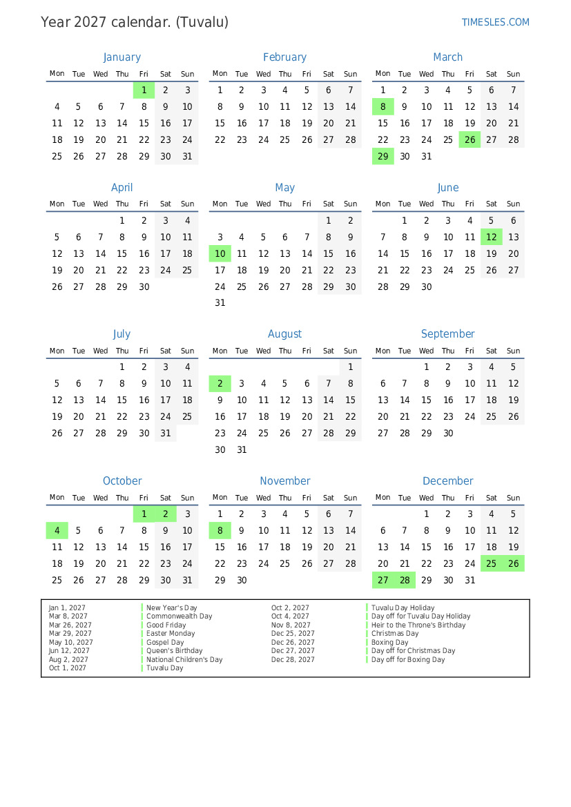 Oct 4, 2027 Day off for Tuvalu Day Holiday
