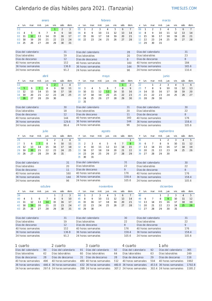 Calendario de días hábiles de mayo de 2021 para Tanzania