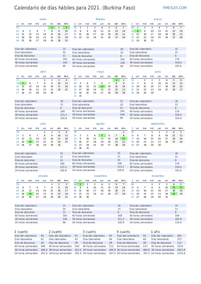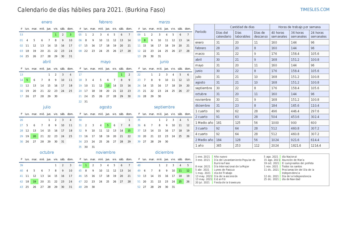 Calendario de días hábiles de julio de 2021 para Burkina Faso