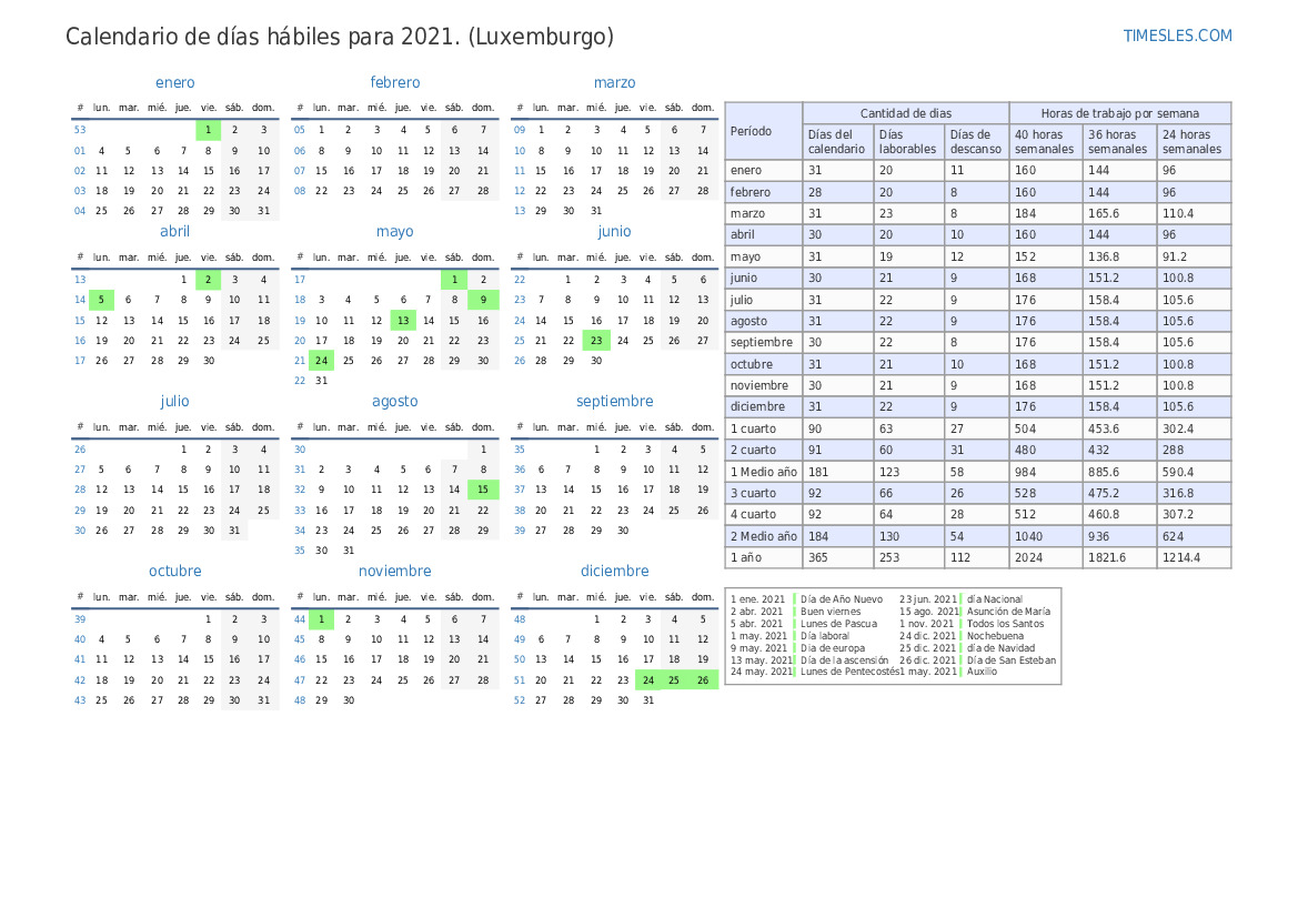 Calendario de días hábiles de julio de 2021 para Luxemburgo
