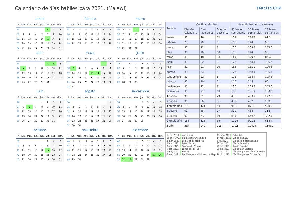 Calendario de días hábiles de agosto de 2021 para Malawi