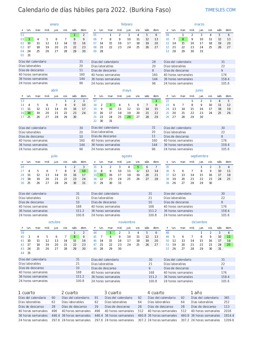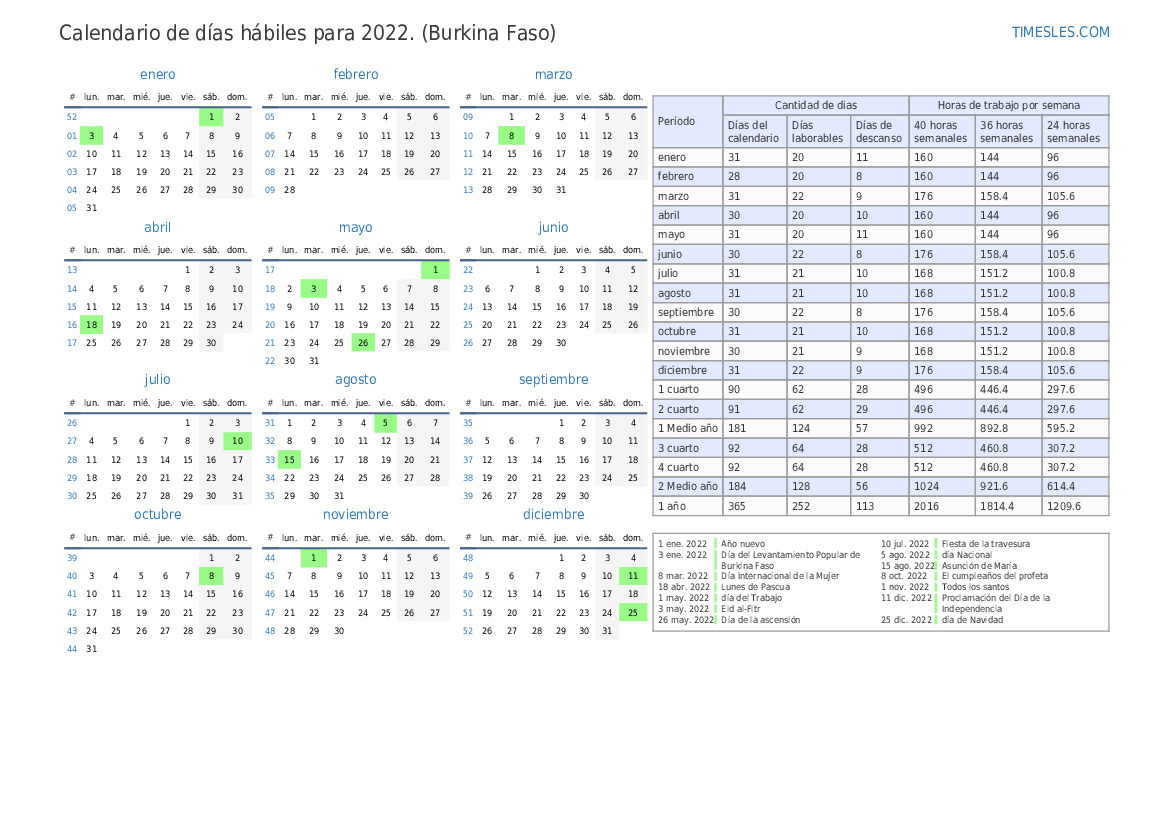 Calendario de días hábiles de junio de 2022 para Burkina Faso