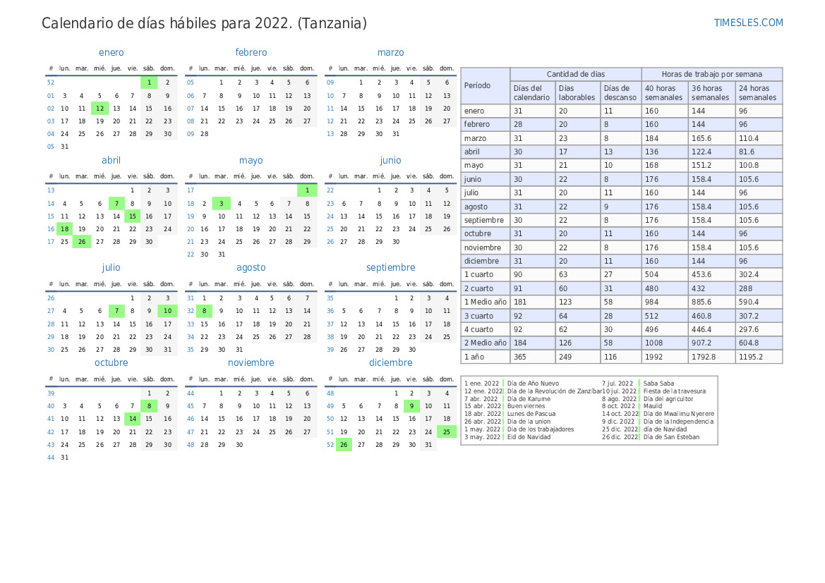 Calendario de días hábiles de agosto de 2022 para Tanzania