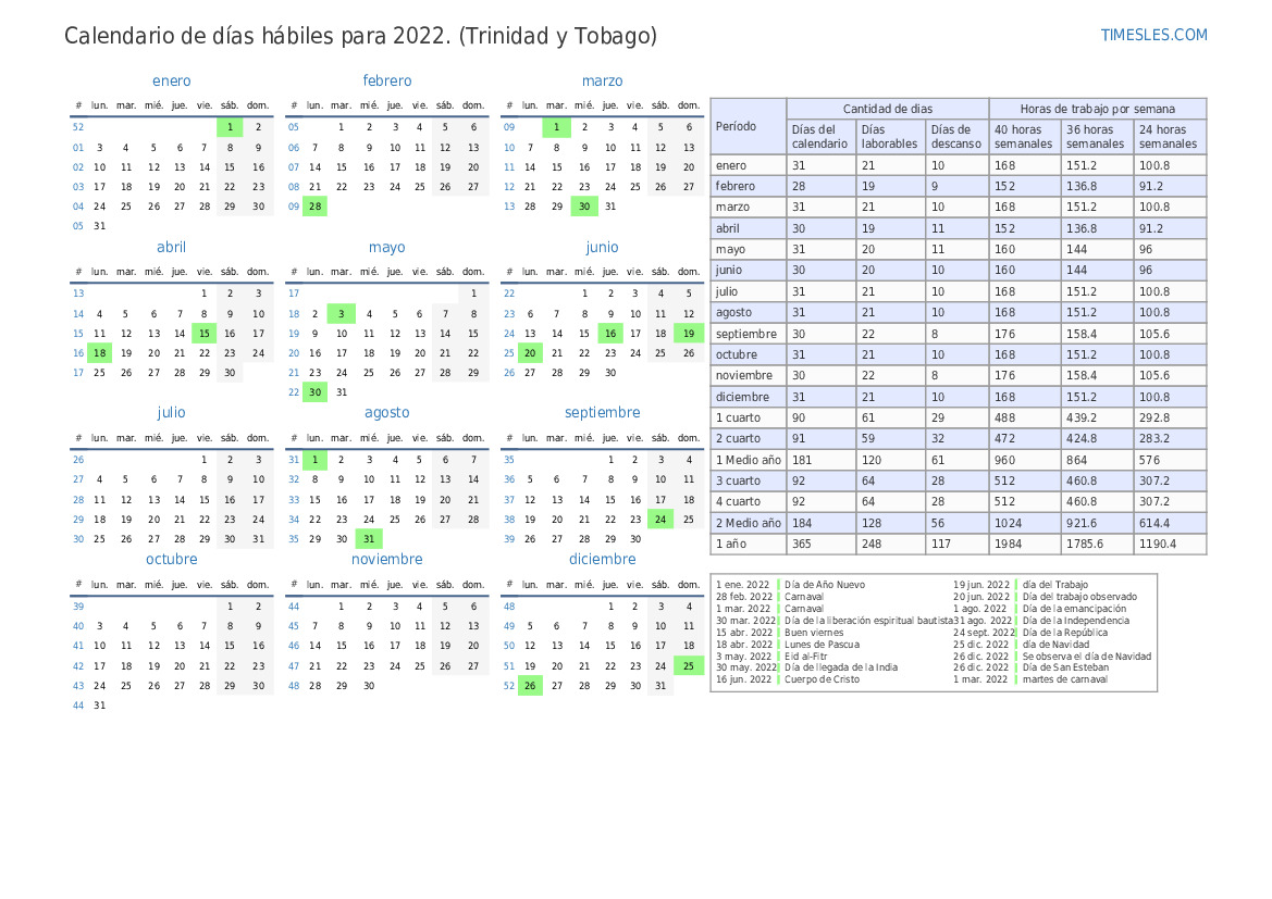 Para el 4 trimestre de 2022, hay 6 feriados y días libres en Trinidad y Tobago. El 4 trimestre de 2022 comienza el en sábado y finaliza el en sábado.