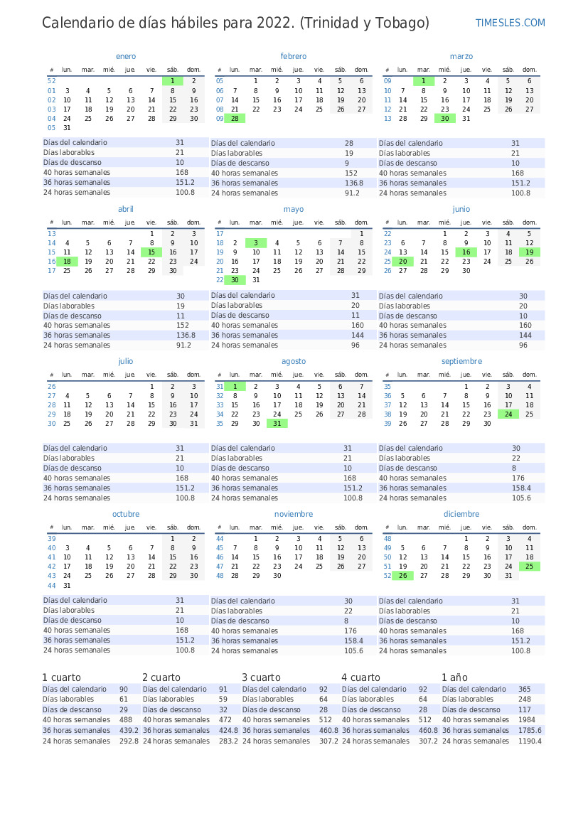 Calendario de días laborales con festivos y fines de semana para el 4 trimestre de 2022 para Trinidad y Tobago