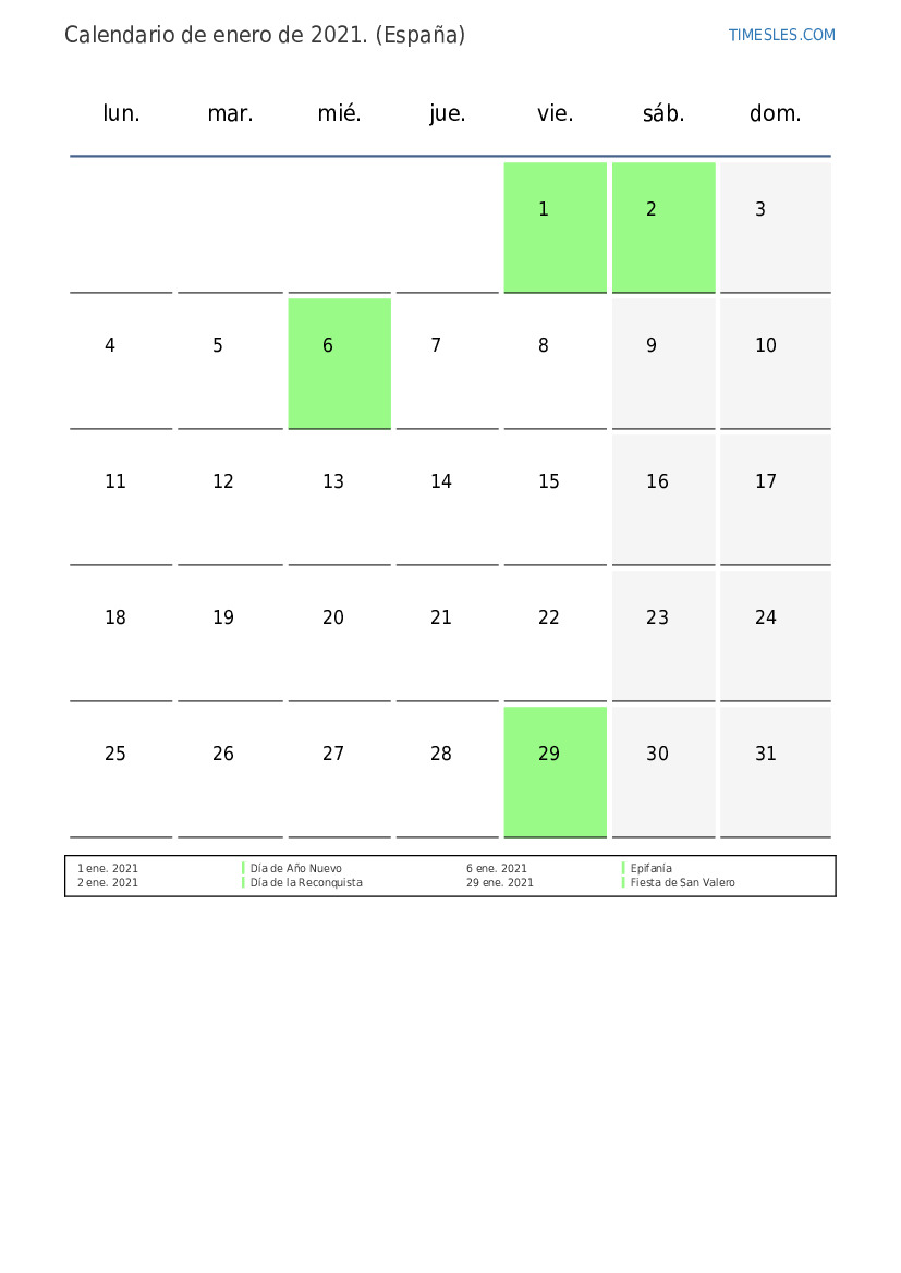 El mes de enero contiene 31 días. Este es 1 mes de 2021. Temporada del año: invierno. El mes de enero comienza el viernes y termina el domingo. En el mes de enero de enero, hay 5 feriados y días libres en España.