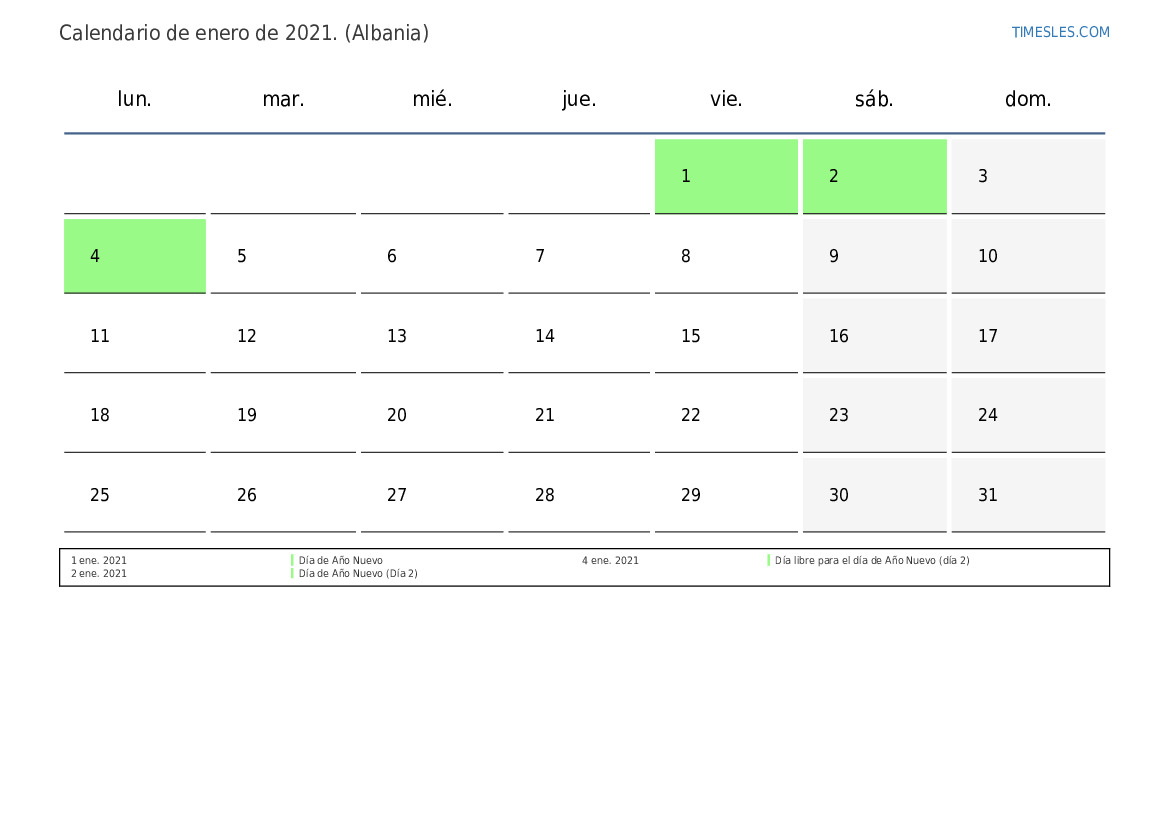 Calendario de feriados y fines de semana de enero de 2021 para Albania