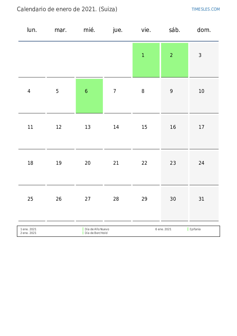 Calendario de feriados y fines de semana de enero de 2021 para Suiza