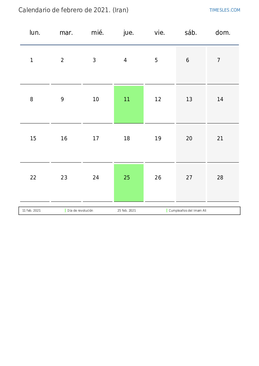El mes de febrero contiene 28 días. Este es 2 mes de 2021. Temporada del año: invierno. El mes de febrero comienza el lunes y termina el domingo. En el mes de febrero de febrero, hay 2 feriados y días libres en Iran.