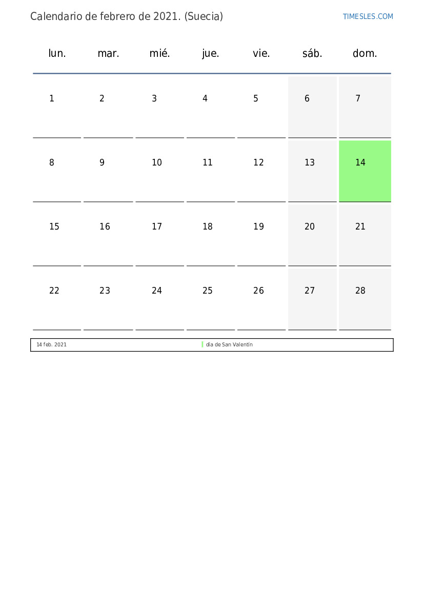 Calendario de feriados y fines de semana de febrero de 2021 para Suecia