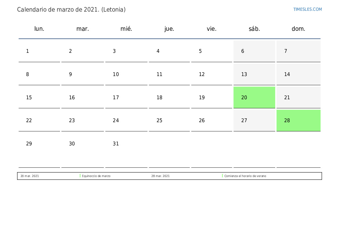 El mes de marzo contiene 31 días. Este es 3 mes de 2021. Temporada del año: primavera. El mes de marzo comienza el lunes y termina el miércoles. En el mes de marzo de marzo, hay 2 feriados y días libres en Letonia.