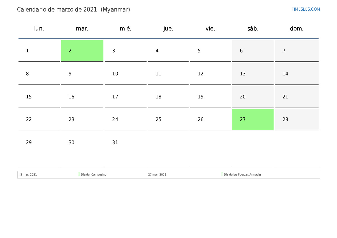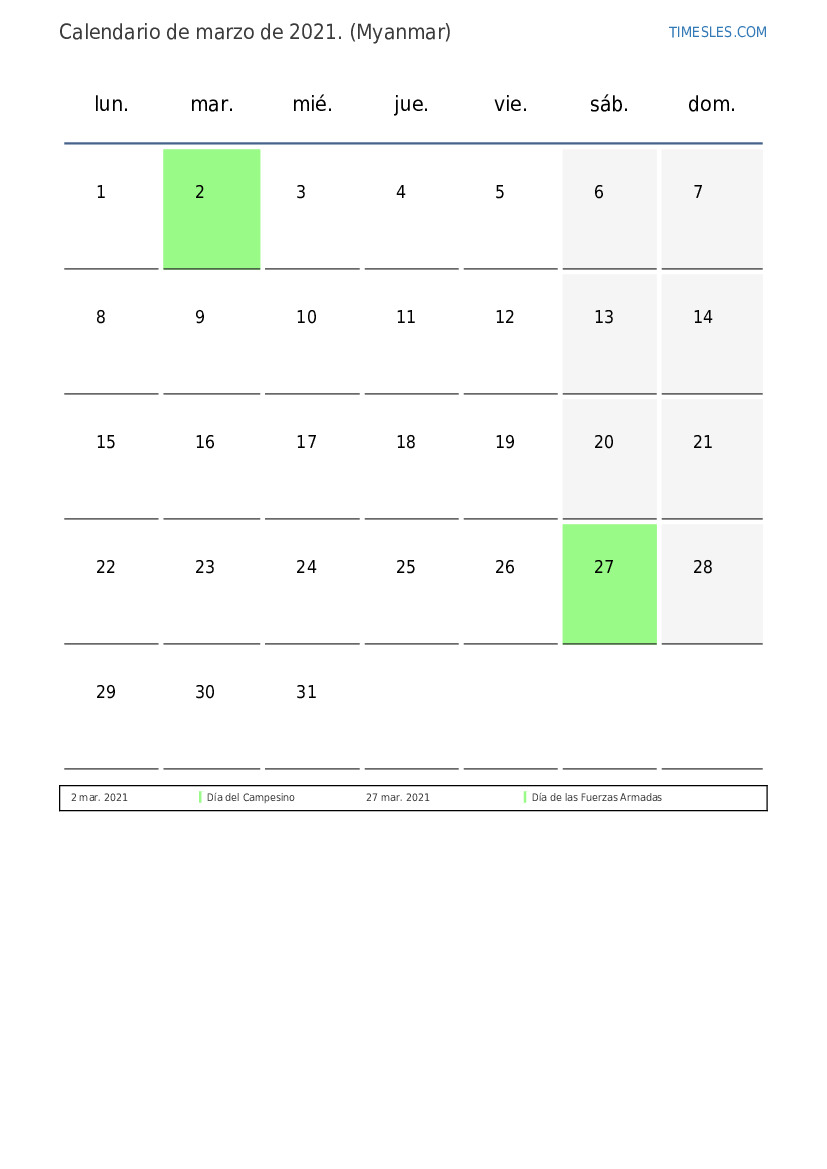 El mes de marzo contiene 31 días. Este es 3 mes de 2021. Temporada del año: primavera. El mes de marzo comienza el lunes y termina el miércoles. En el mes de marzo de marzo, hay 3 feriados y días libres en Myanmar.