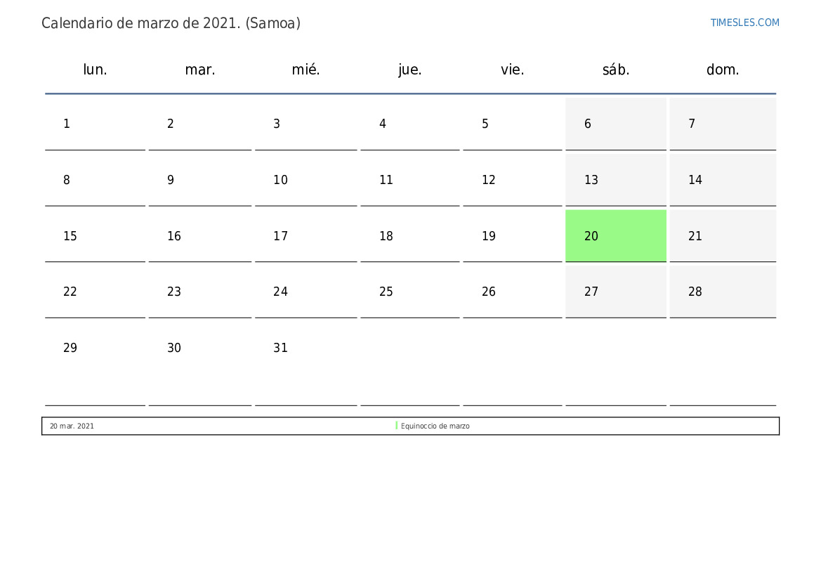 El mes de marzo contiene 31 días. Este es 3 mes de 2021. Temporada del año: primavera. El mes de marzo comienza el lunes y termina el miércoles. En el mes de marzo de marzo, hay 1 feriado y día libre en Samoa.