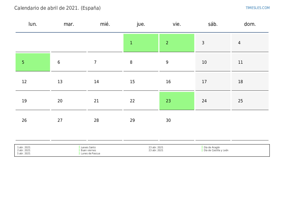 Descargue e imprima el calendario en PDF con feriados y fines de semana de abril de 2021 para España