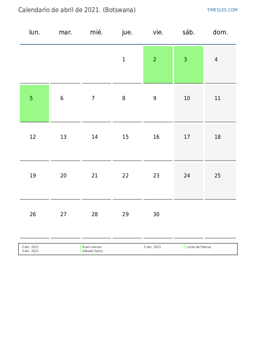 Descargue e imprima el calendario en PDF con feriados y fines de semana de abril de 2021 para Botswana