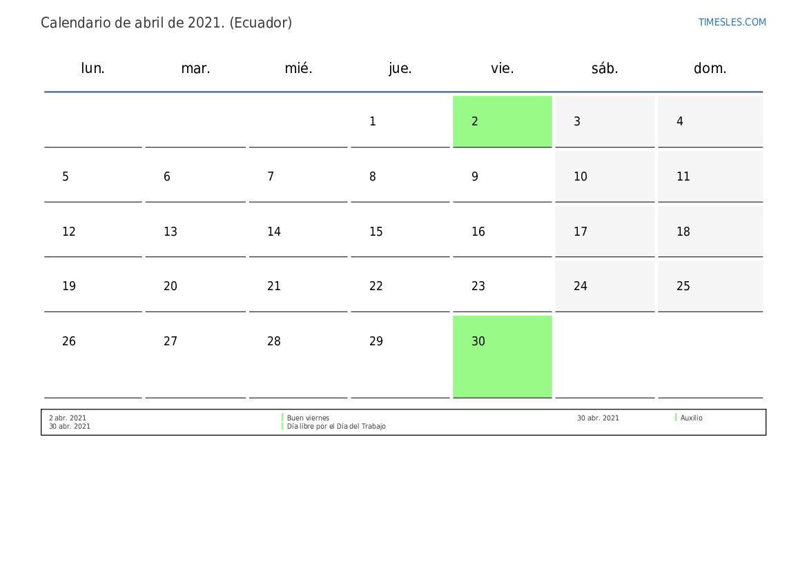 Calendario de feriados y fines de semana de abril de 2021 para Ecuador