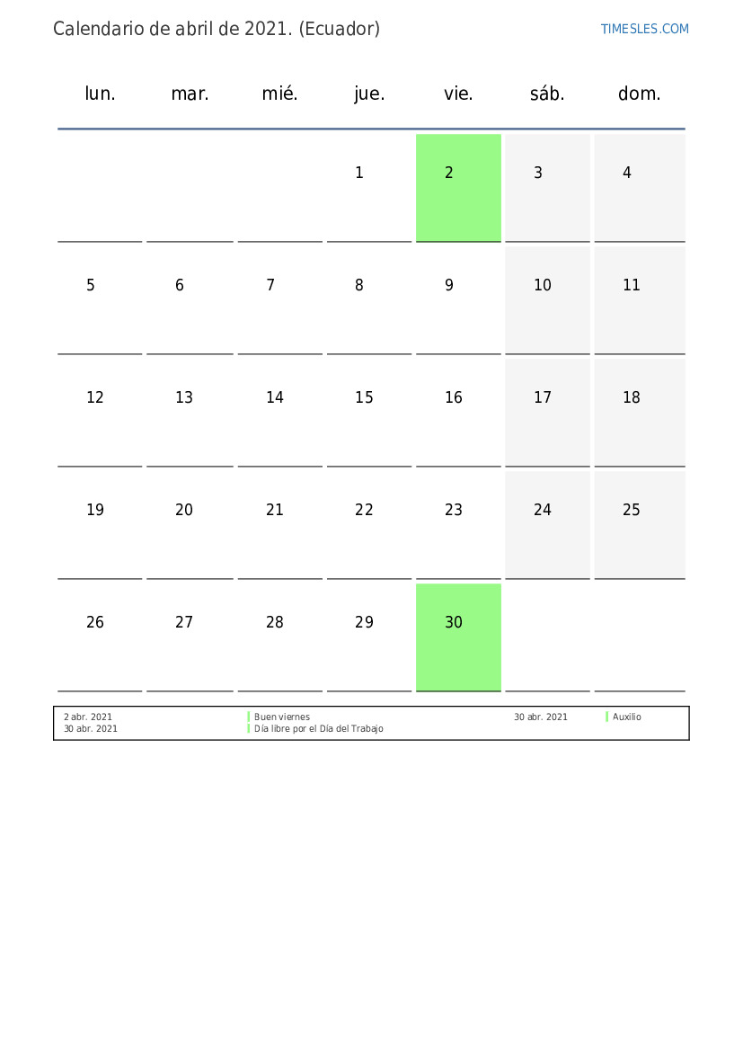 Descargue e imprima el calendario en PDF con feriados y fines de semana de abril de 2021 para Ecuador