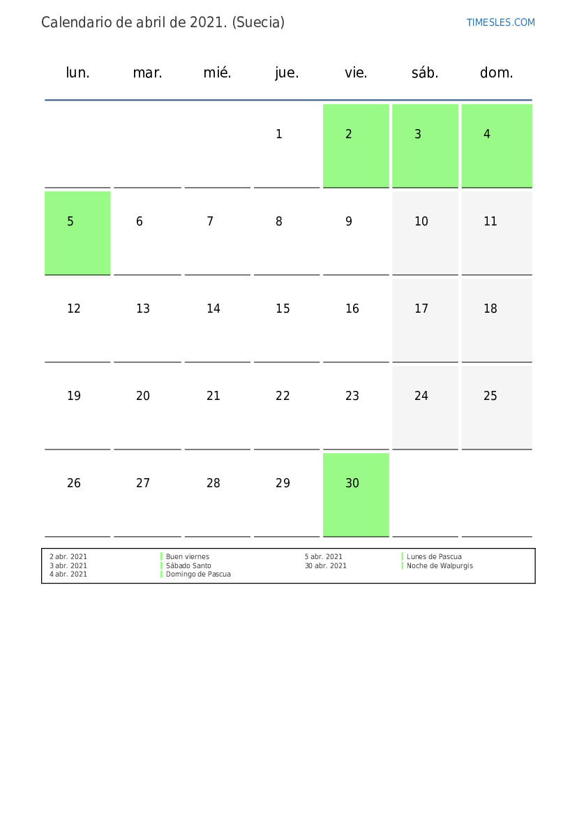 Calendario de feriados y fines de semana de abril de 2021 para Suecia