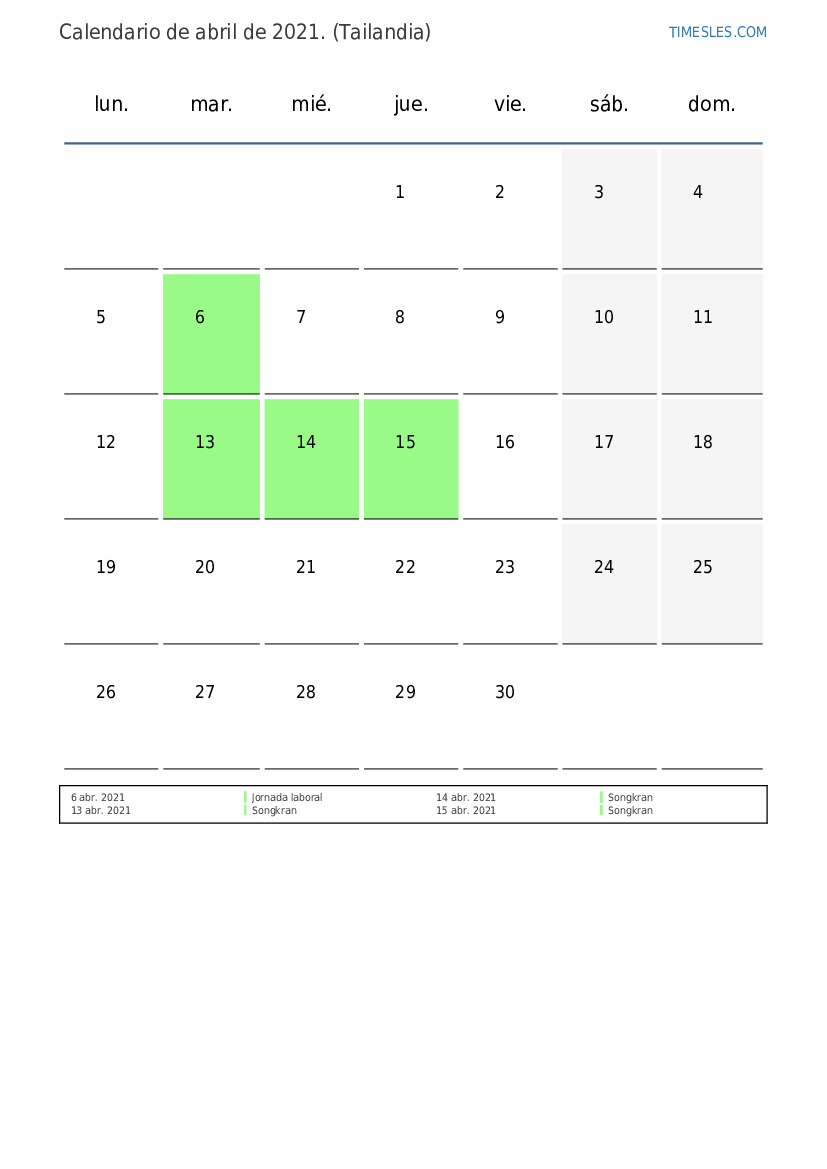 Descargue e imprima el calendario en PDF con feriados y fines de semana de abril de 2021 para Tailandia