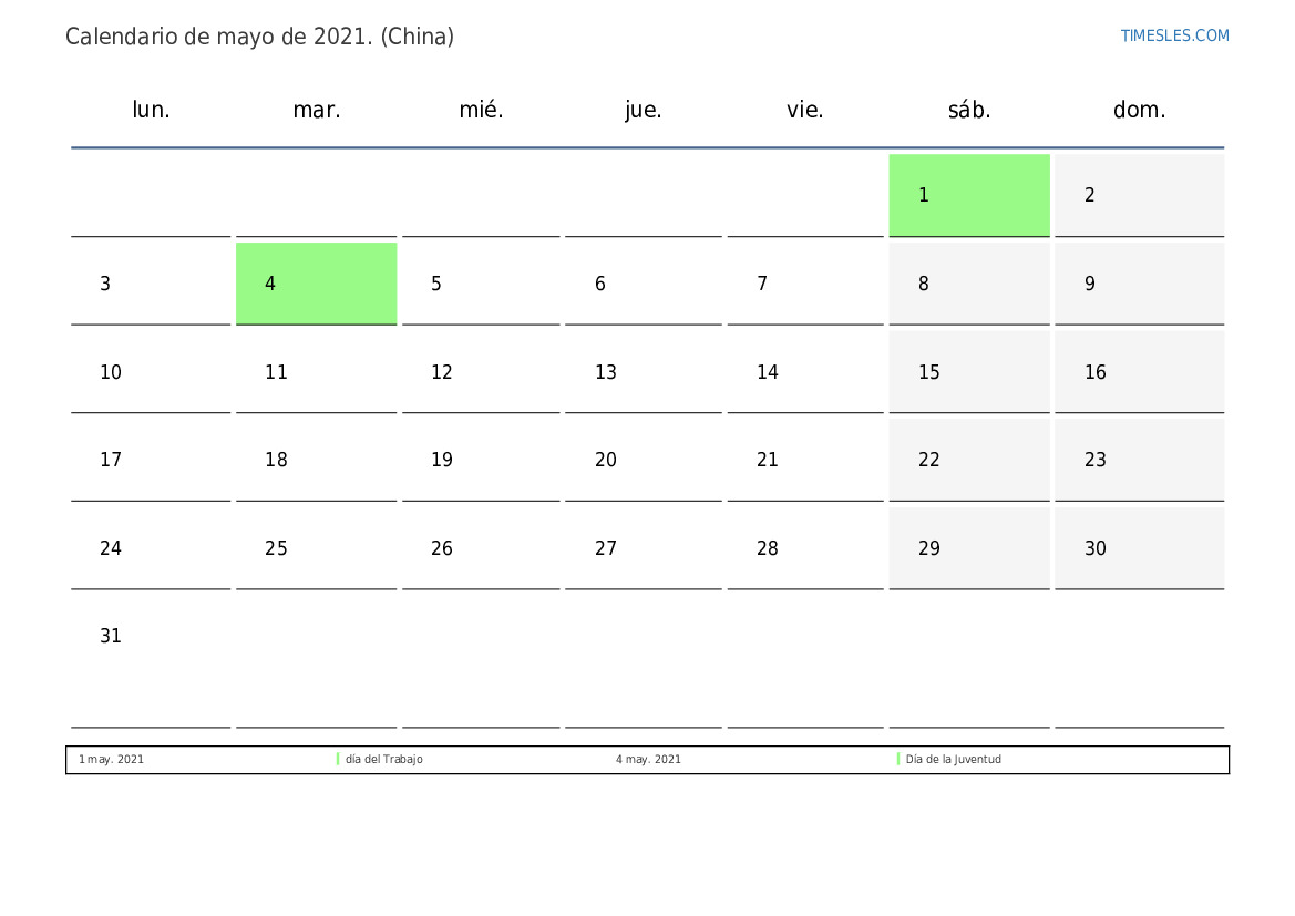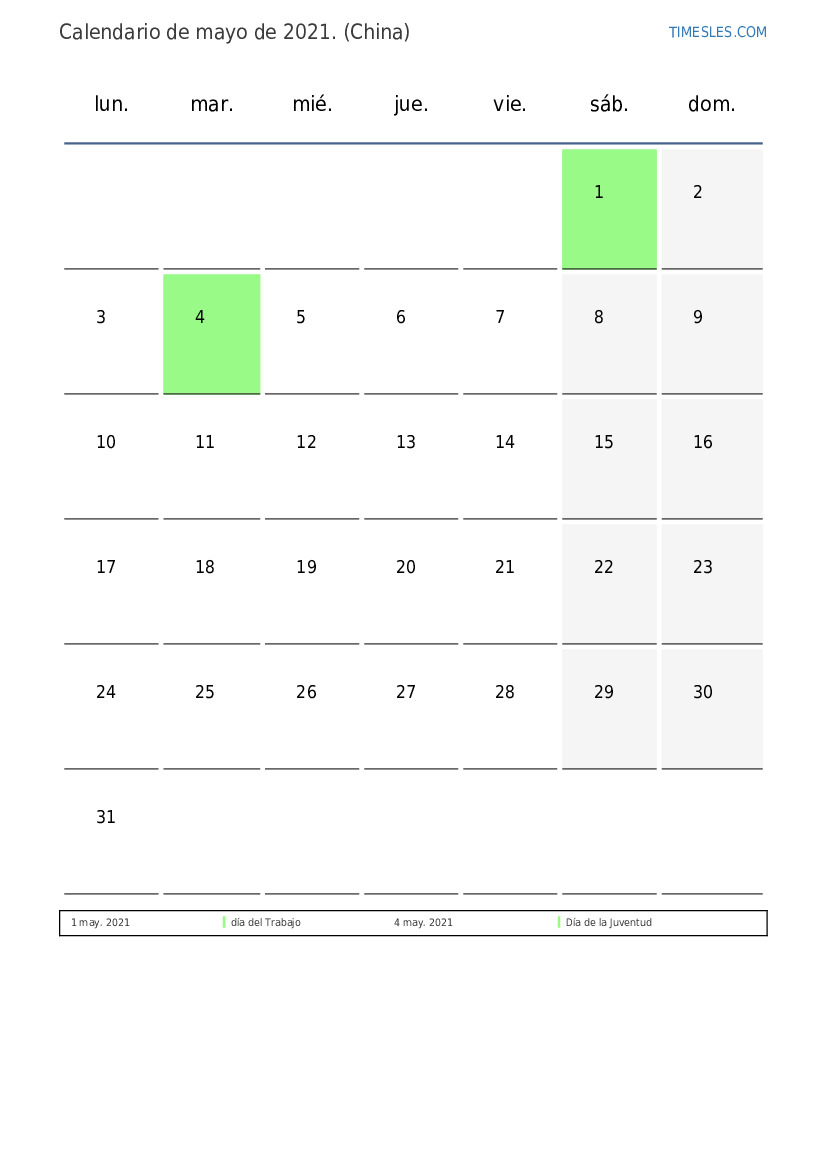 Calendario de feriados y fines de semana de mayo de 2021 para China
