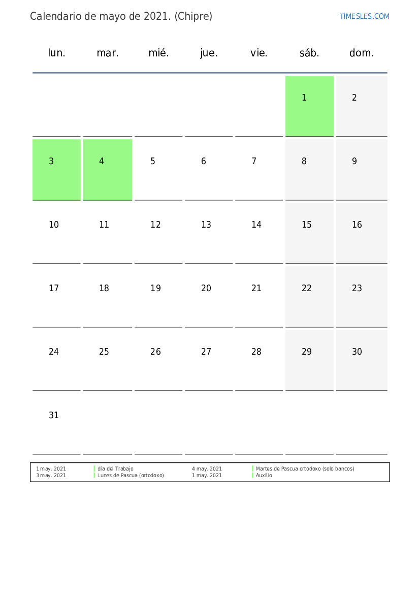 Calendario de feriados y fines de semana de mayo de 2021 para Chipre