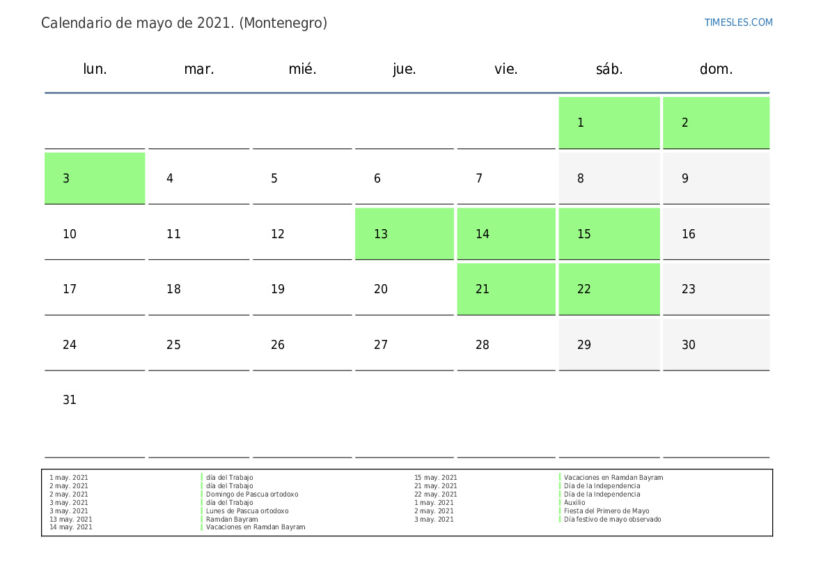 Calendario de feriados y fines de semana de mayo de 2021 para Montenegro
