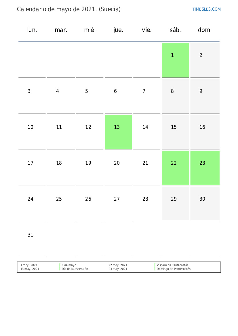 Calendario de feriados y fines de semana de mayo de 2021 para Suecia