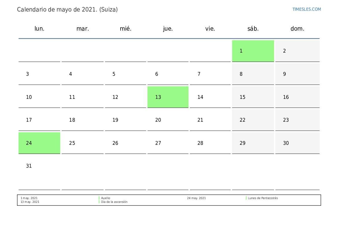 Calendario de feriados y fines de semana de mayo de 2021 para Suiza