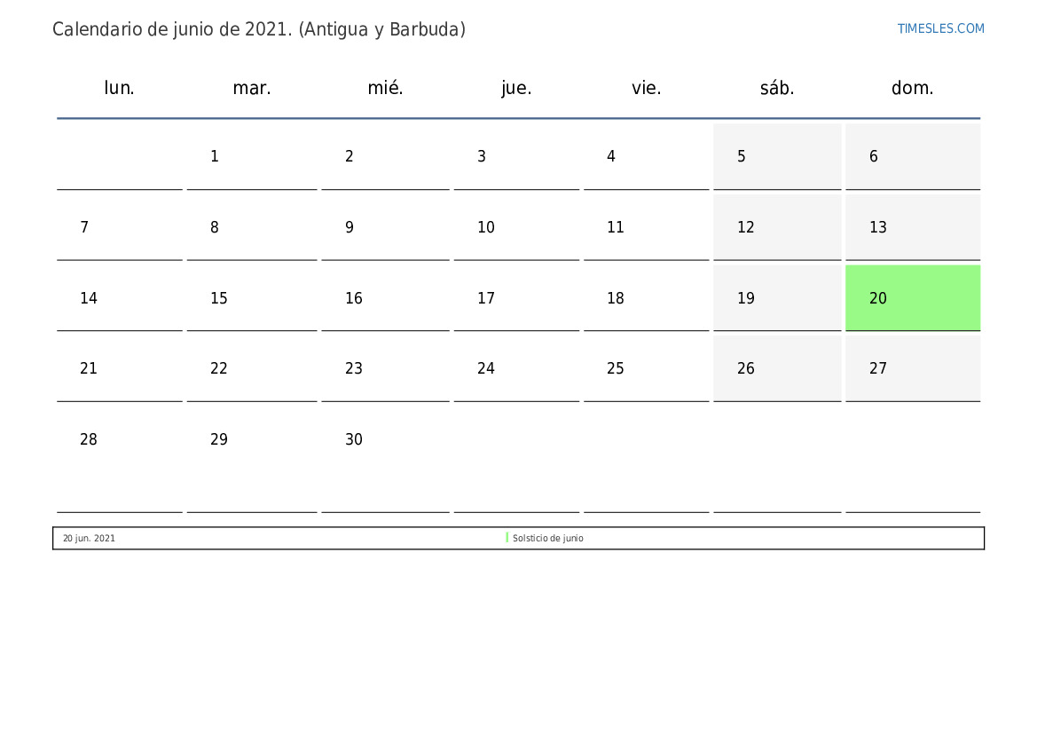 Calendario junio 2021 para Antigua y Barbuda
