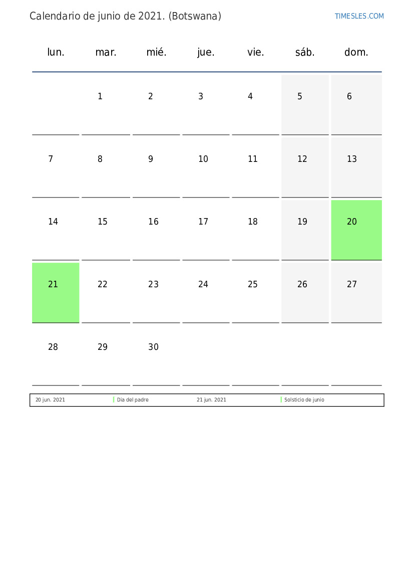 Descargue e imprima el calendario en PDF con feriados y fines de semana de junio de 2021 para Botswana