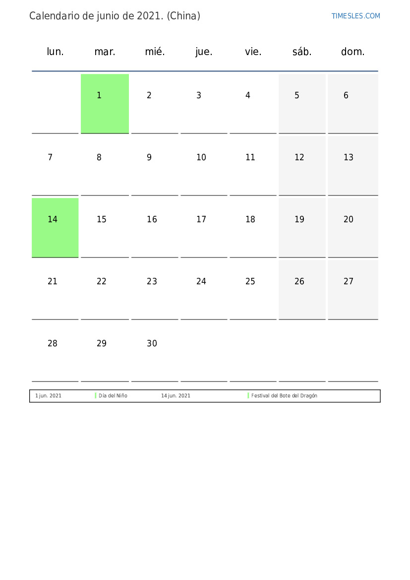 Calendario de feriados y fines de semana de junio de 2021 para China