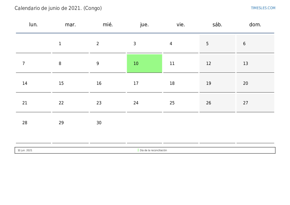 Calendario de feriados y fines de semana de junio de 2021 para el Congo