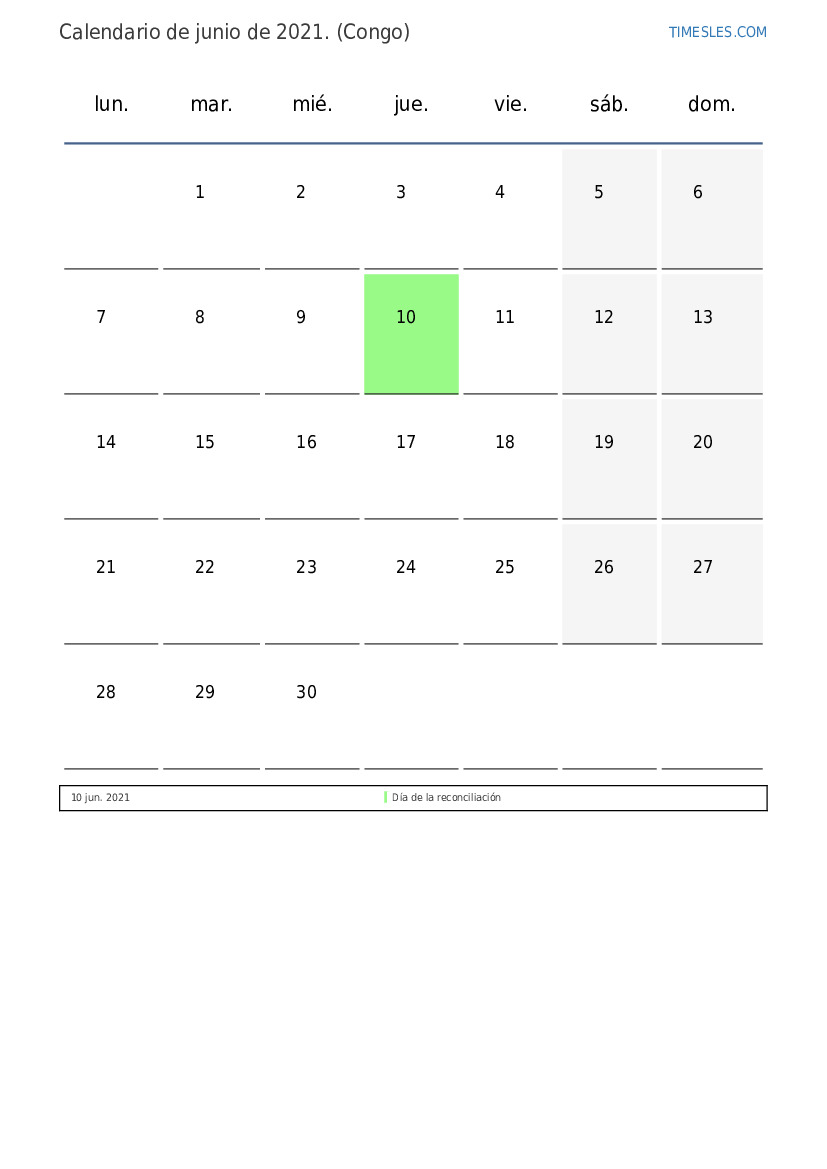 Descargue e imprima el calendario en PDF con feriados y fines de semana de junio de 2021 para el Congo