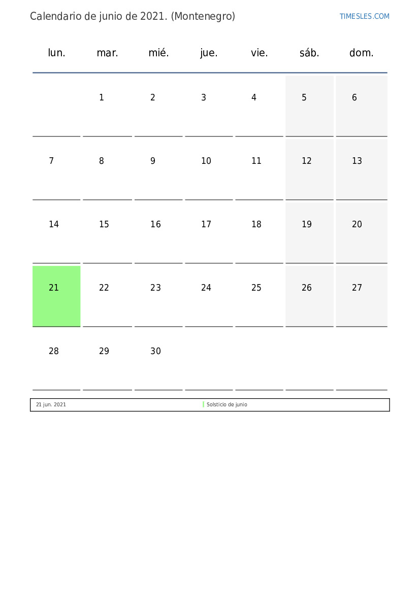 El mes de junio contiene 30 días. Este es 6 mes de 2021. Temporada del año: el verano. El mes de junio comienza el martes y termina el miércoles. En el mes de junio de junio, hay 1 feriado y día libre en montenegro.