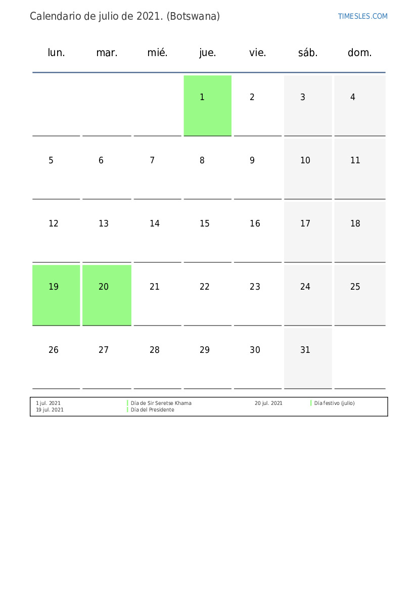El mes de julio contiene 31 días. Este es 7 mes de 2021. Temporada del año: el verano. El mes de julio comienza el jueves y termina en sábado. En el mes de julio de julio, hay 3 feriados y días libres en Botswana.