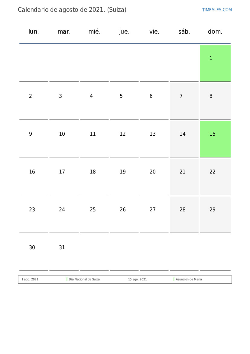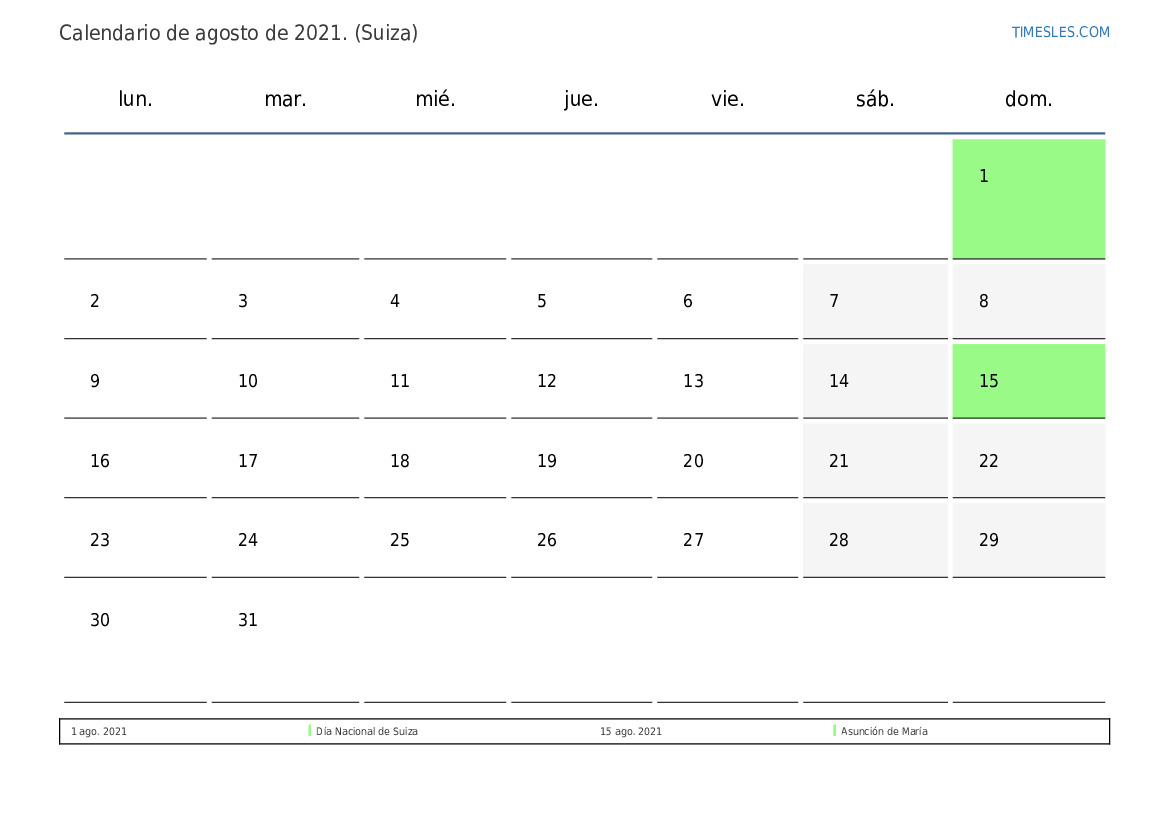 Calendario de feriados y fines de semana de agosto de 2021 para Suiza