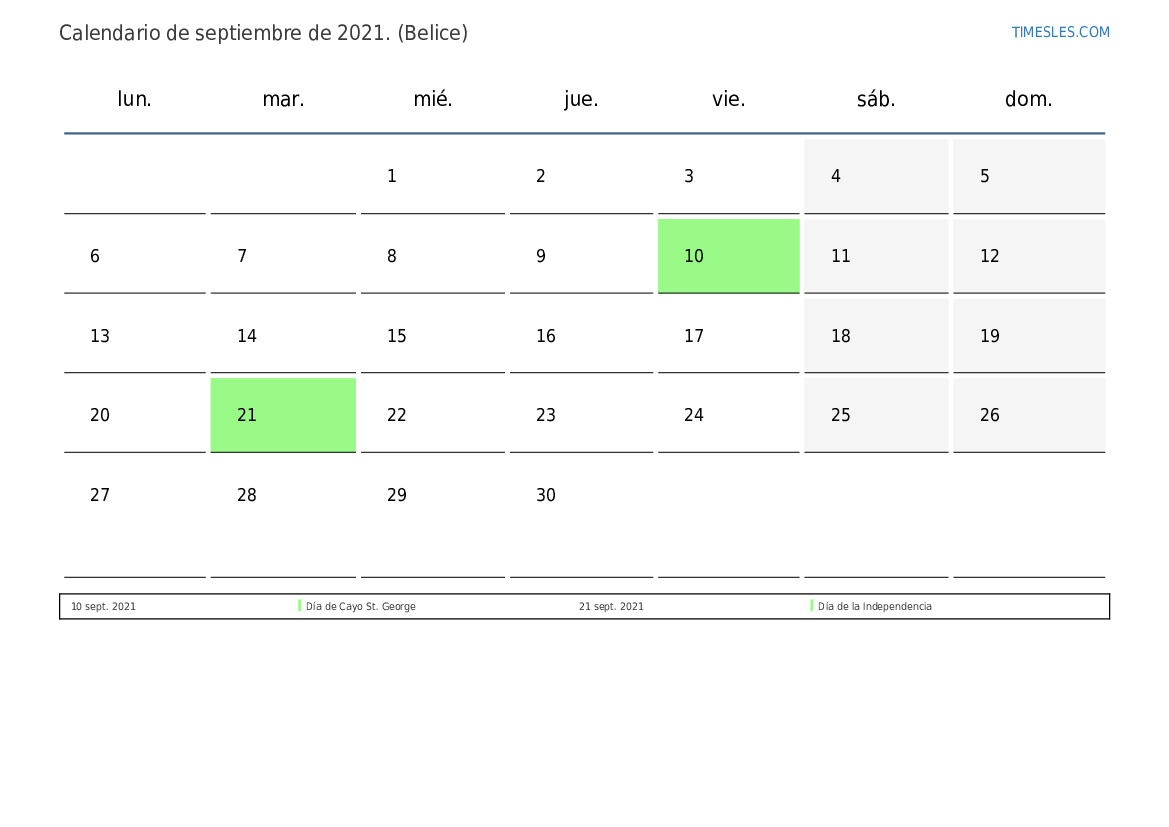 Descargue e imprima el calendario en PDF con feriados y fines de semana de septiembre de 2021 para Belice